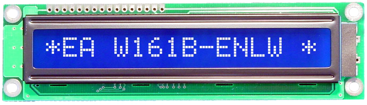 24 | ![]() | Hersteller-Artikel-Nr. EA W161B-ENLW(EA W161B-ENLW) DISPLAY VISIONS LCD Modul Dot Matrix 16x1 LED blau/weiß | Kunden-Artikel-Nr. Kunden-Projekt-Nr. | 20 Stück Planlieferzeit Ø 10 Wochen Lieferbar (ab Lager) | (mind. 1 Stück o. ein Vielf. von 1) | LCD Modul | DISPLAY VISIONS | 5.0 V | 0.0 °C | 50.0 °C | ||||||||