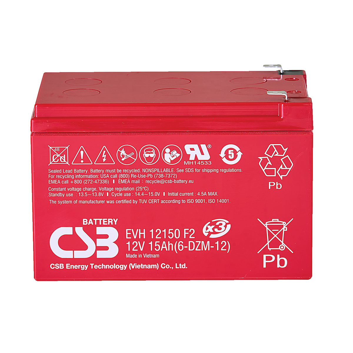 422 | ![]() | Manufacturers Part No. EVH12150X3(EVH12150X3) CSB Lead-acid batteries EVH 12V 15.000mAh L151mm B98mm H97,5mm Male Tab Connector 6,4 | Customer Part No. Customer Project No. | 5 Pcs. Planned Delivery Time Ø 2 Weeks Available (from stock) | (at least 1 or mul. of 1) | |||||