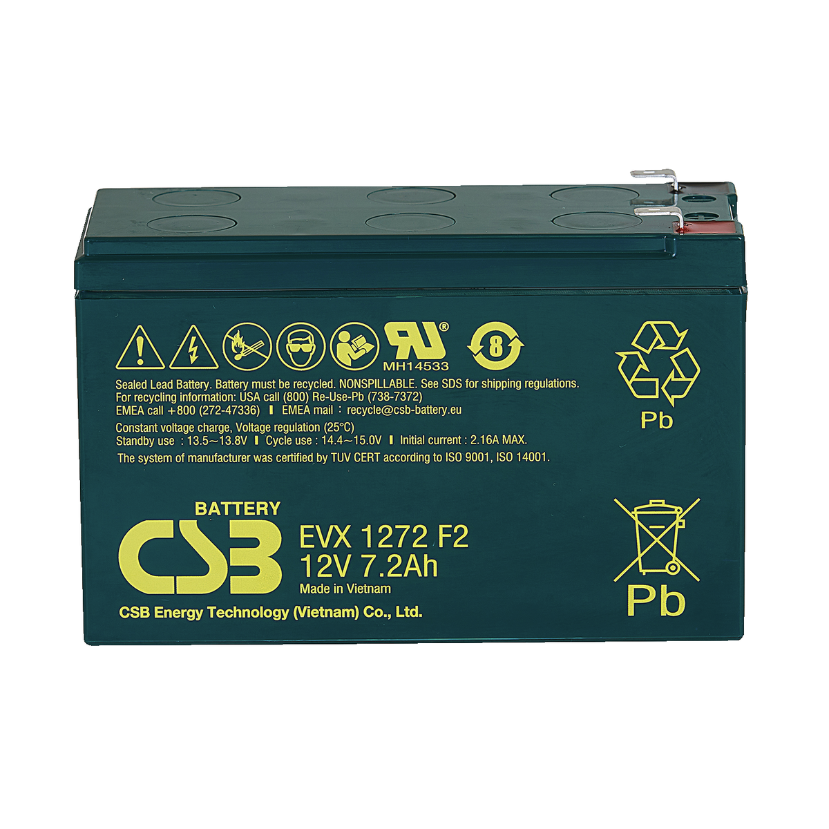 421 | ![]() | Manufacturers Part No. EVX12120F2(EVX12120F2) CSB Lead-acid batteries EVX 12V 12.000mAh L151mm B98mm H94,1mm Male Tab Connector 6,4 | Customer Part No. Customer Project No. | 0 Pcs. Planned Delivery Time Ø 2 Weeks Available on order | (at least 6 or mul. of 6) | |||||