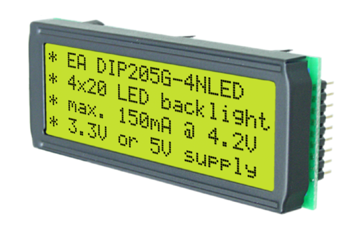 570 | ![]() | Manufacturers Part No. EADIP205B-6NLW(EADIP205B-6NLW) DISPLAY VISIONS LCD Module Dot Matrix 4x20 LED blue | Customer Part No. Customer Project No. | 4 Pcs. Planned Delivery Time Ø 2 Weeks Available (from stock) | (at least 1 or mul. of 1) | LCD Module | DISPLAY VISIONS | 3.3 V | 3.3 V | 4x20 | LED | blue | white | -20.0 °C | 70.0 °C | |||||||||||||