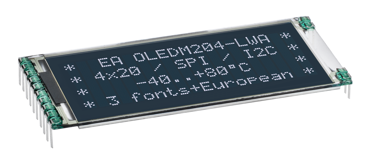 10 | ![]() | Manufacturers Part No. EAOLEDM204-LWA(EAOLEDM204-LWA) DISPLAY VISIONS Display OLED Alphanumeric 20x4/3/2 black | Customer Part No. Customer Project No. | 3 Pcs. Planned Delivery Time Ø 2 Weeks Available (from stock) | (at least 1 or mul. of 1) | OLED Module | DISPLAY VISIONS | Dot Matrix | SPI | 2.4 V | 5.5 V | 20x4/3/2 | white | black | -40.0 °C | 80.0 °C | |||||