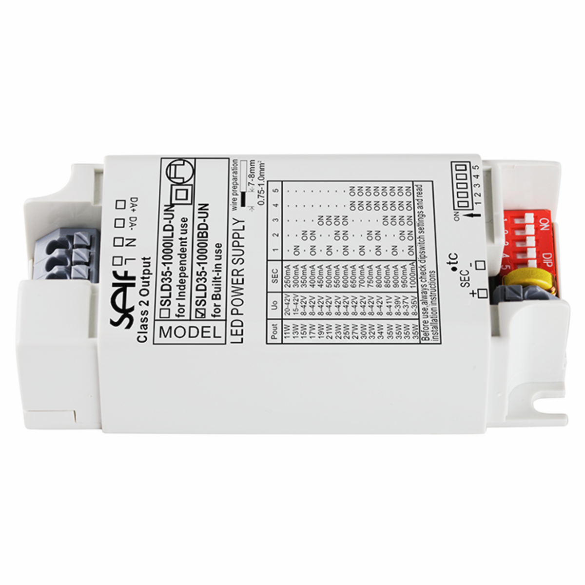 103 | ![]() | Manufacturers Part No. SLD35-1000IBD-UN(SLD35-1000IBD-UN) Self AC/DC LED power supply unit CC 35W 1A IP20 Dali-2 | Customer Part No. Customer Project No. | 16 Pcs. Available (from stock) | (at least 1 or mul. of 1) | Self | 35.0 W | 1.0 A | 8.0 V | 42.0 V | Dali-2 | Enclosed Plastic | IP20 | 87.0 % | 110.0 V | 277.0 V | -25.0 °C | 45.0 °C | 96.0 mm | 42.0 mm | 30.0 mm | Push-In Terminal | Lighting | CE EN UKCA | EN 61347-1 EN 61347-2-13 | DC compatible Output Current Selectable | |||||
