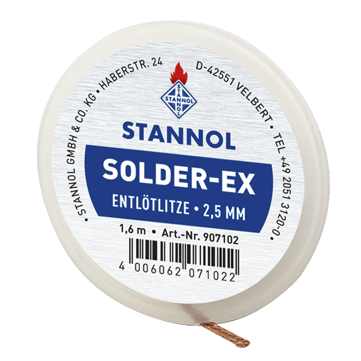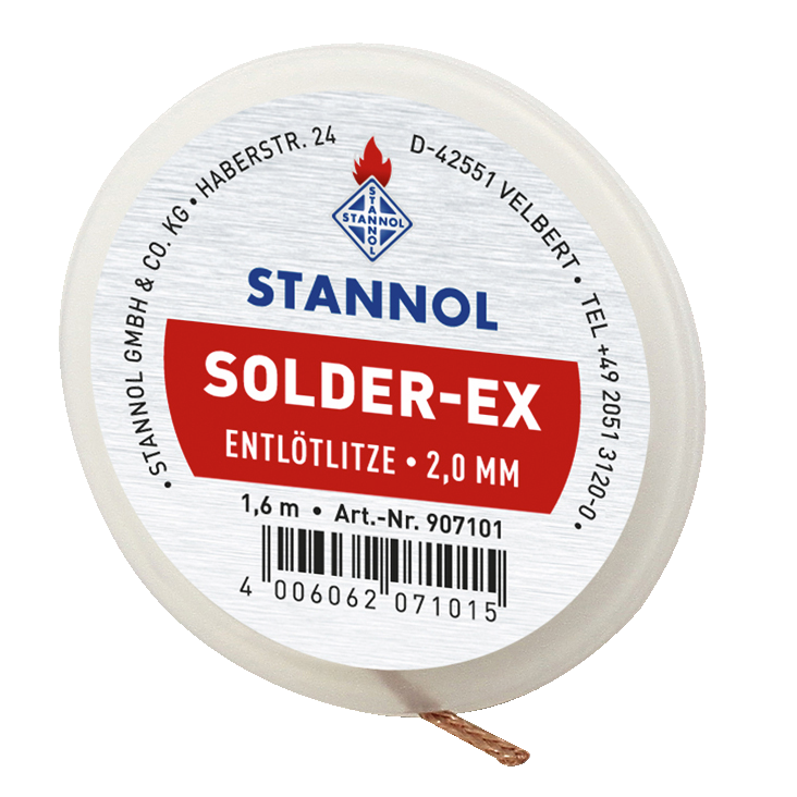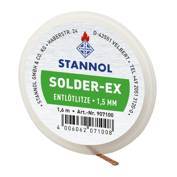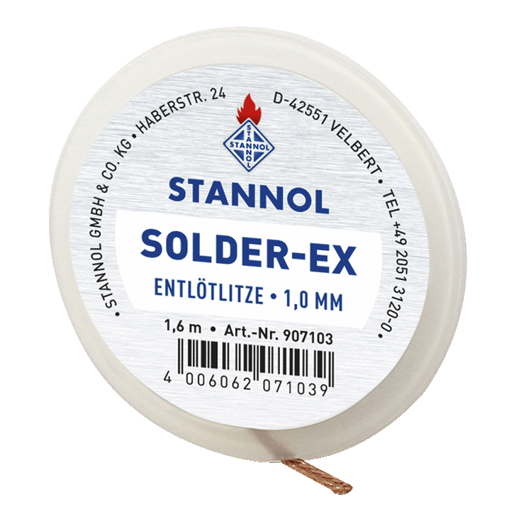 The Stannol Solder-Ex desoldering braid is placed on the solder to be removed. The stranded wire is heated at the end with a soldering iron until the solder melts. The capillary action sucks the solder into the stranded wire. The stranded wire is then removed and the part filled with solder is cut off. A sudden heat shock, as it occurs with vacuum suction systems, is avoided because the because the stranded wire is placed on the soldered joint in a cold state.