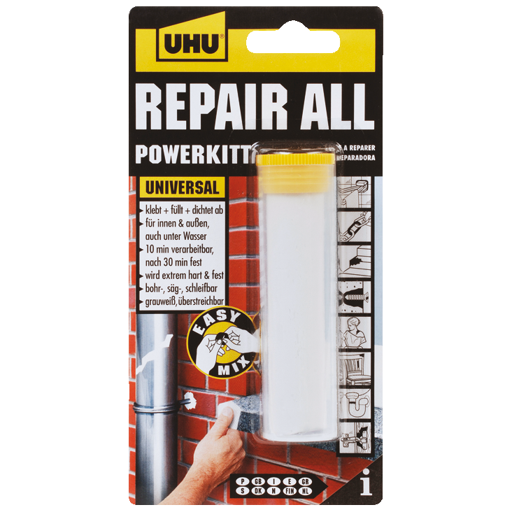 Application:Take 1 or several portions depending on the size of the application. Knead with your fingers until a homogeneous colour (dark gray) is obtained. If kneading is difficult, bring the rod at room temperature. Apply within 2 minutes after mixing and put into shape. Cut off excess mass with a knife.